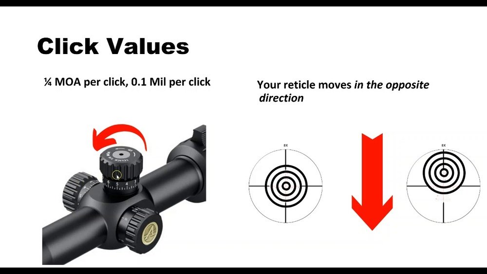 Most modern scopes have “click” adjustments—each click moves the reticle a certain amount, often ¼ MOA (Minute of Angle) or 0. 1 MRAD.